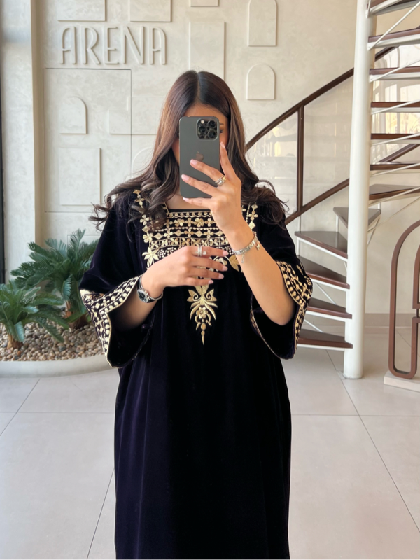 جلابيه مخمل بنفسجي غامق مطرزه بالذهبي، ممكن استخدام الحزام من الداخل. ممكن تغير اللون