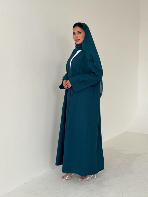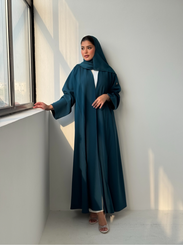 عباية كلوش خفيف بتطريز وردي واخضر فاتح مع تدخيلات حرير في الاطراف