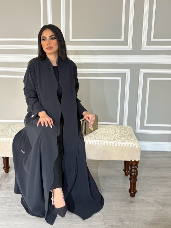 عباية باللون الرمادي الفحمي وقصة امامية مموجة مع ازرار كرستالية 🤍
