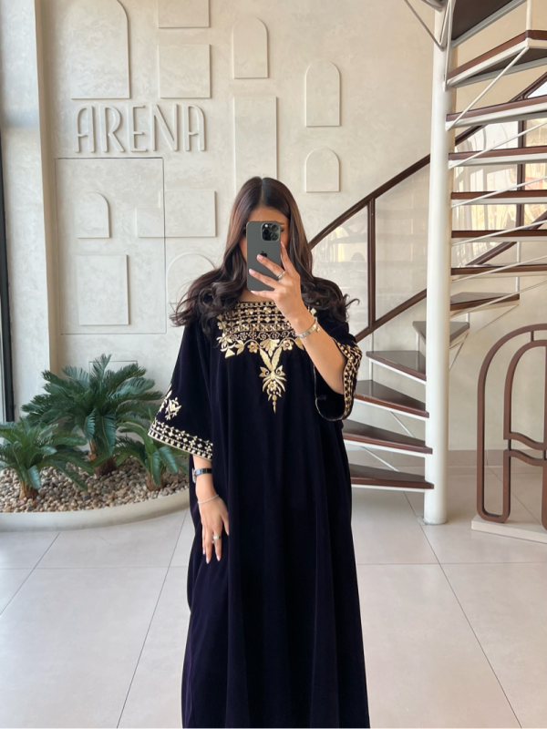 التصميم مكون من جاكيت قصير بأكمام واسعة مع تفاصيل تطريز دقيقة، بالإضافة إلى تنورة طويلة بنقوش تجريدية باللونين الأسود والرمادي، اللي بدوره يعطي لمسة عصرية وجريئة. العباية مفتوحة من الأمام، و هذا الشي اللي يخليها مثالية للتنسيق مع ملابس أنيقة.