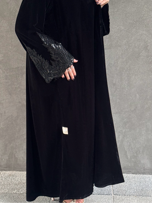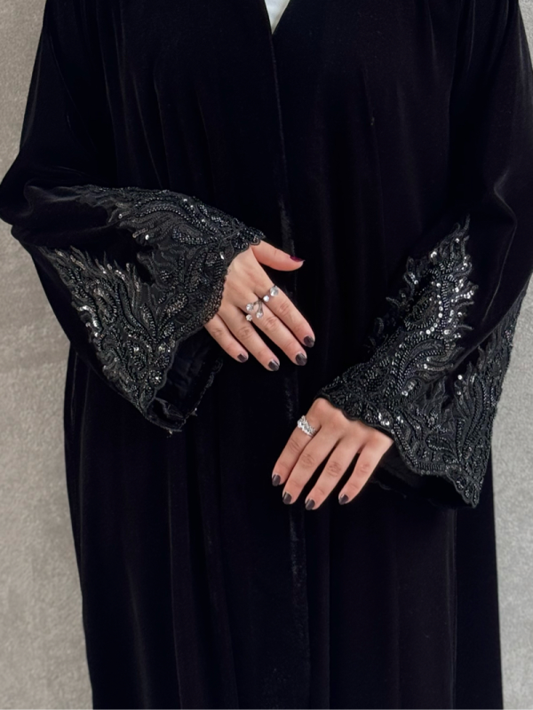 لما يبرد الجو وتدفى القلوب… تجي هالعباية المخملية كاختيار يشبه هالليالي: ناعمة، فخمة، وتلمع بهدوء مع كل حركة. تطريز الأكمام يحكي عن احتفال راقٍ، والمخمل يحتضنك بدفا يليق بشتاء الذكريات. عباية للي تحب تستقبل هالليالي بروح أنيقة 🎇