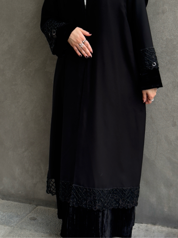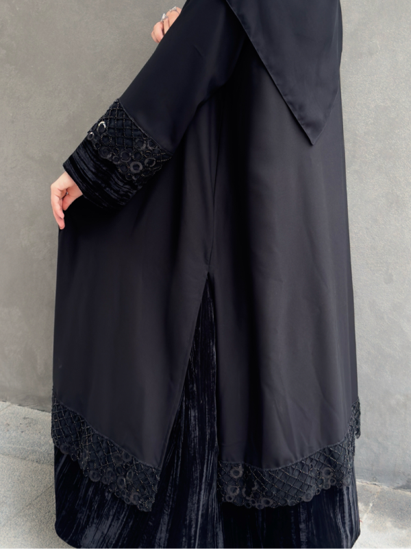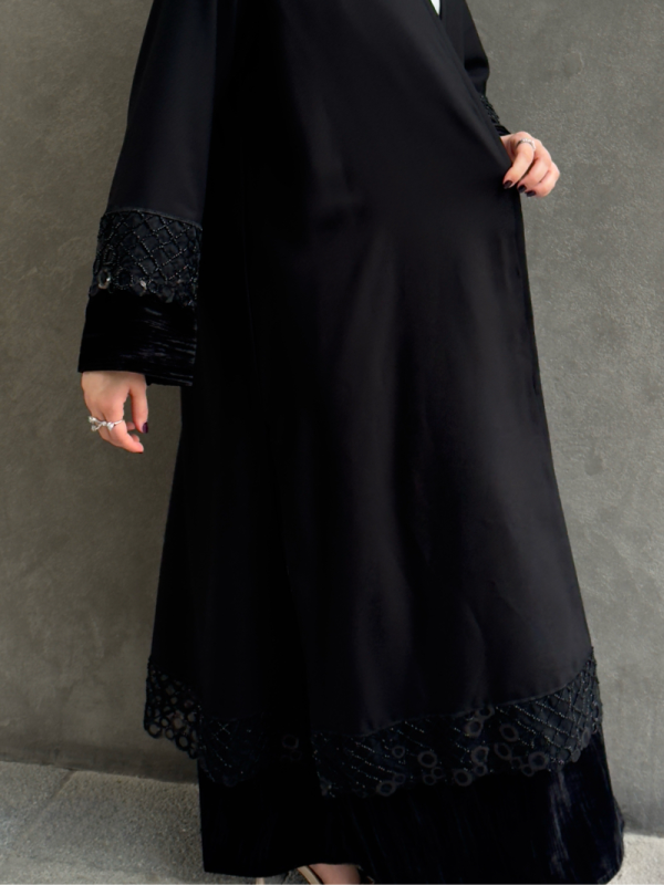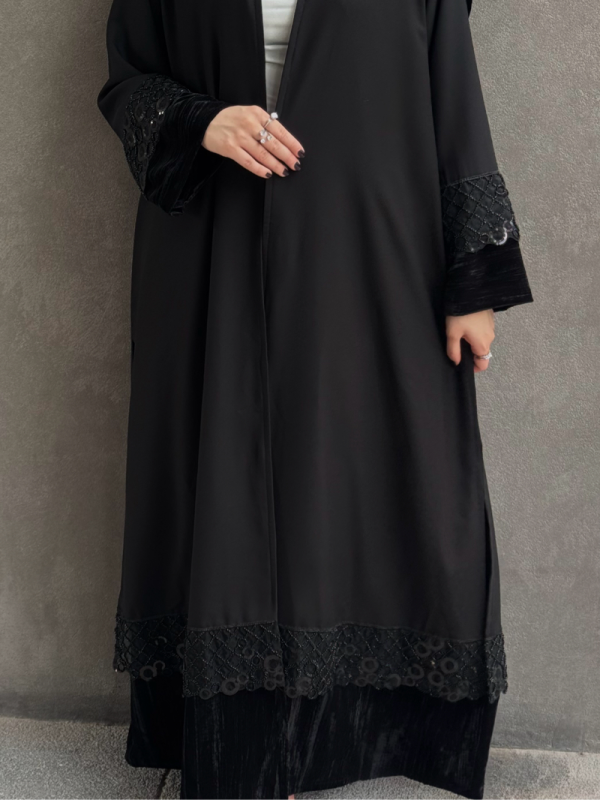 هالعباية تجمع الاثنين: قماش انسيابي يلفك براحة، ولمسات مخملية تعطي إحساس الدفا والفخامة. اختيارك للمشوار، وللجلسة العائلية، ولكل لحظة تبين فيها أناقتك تكون بسيطة… لكنها دافئة ✨🎵 مكونة من ثلاث انواع من الاقمشه ، كريب و مخمل و دانتيل 🎵