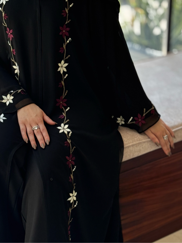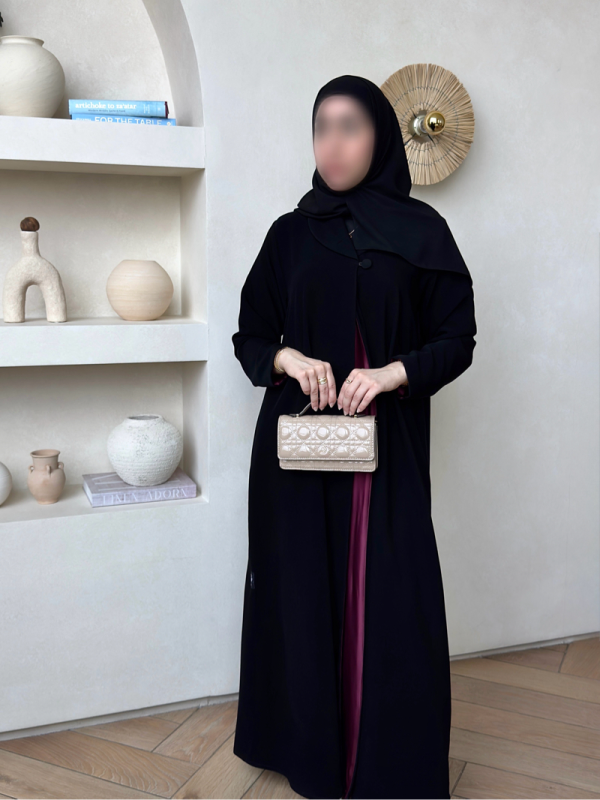 فاخرة بلمسة بسيطة ✨🖤 عباية سوداء أنيقة بتفاصيل داخلية بلون خمري فاخر، تجمع بين البساطة والفخامة. تصميمها الانسيابي مع اللمسة الحريرية الداخلية يعطيها طابع مميز يلفت الأنظار. تناسب إطلالاتك اليومية والسهرة، خاصة مع الاكسسوارات الناعمة 🫶🏻✨✨